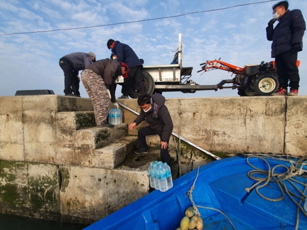 이에 맑은물사업소 직원들은 지난 27일 아침 일찍 2리터 병물 600병을 트럭에 싣고 군산 선착장으로 출발했고 유부도 주민들은 경운기를 동원해 현지에서 이들을 맞이했다.
