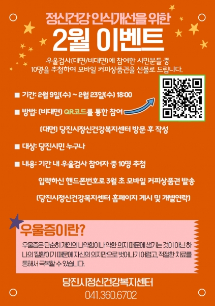 당진시민이면 누구나 참여 가능한 이번 이벤트는 QR코드를 통한 비대면과 당진시정신건강복지센터를 방문해 참여하는 대면 방식 두 가지로 오는 23일까지 진행된다.