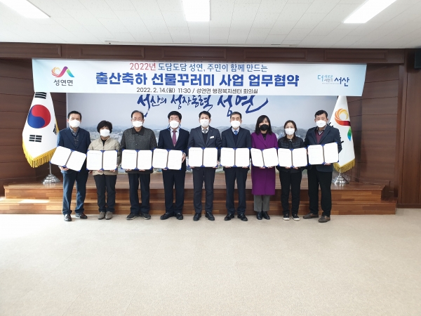 성연면은 14일 행정복지센터에서 지역 10개 기관·사회단체와 ‘출산 축하 선물꾸러미 사업’추진을 위한 업무협약을 맺었다.