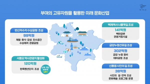 사업비 302억원을 확보해 규암면 진변리 일원에 백마강 시화문학관과 테마공원, 부산서원과 백강마을 등을 짓고 유교문화자원 중심 풍류길과 5개 누정을 정비할 계획이라고 전했다.