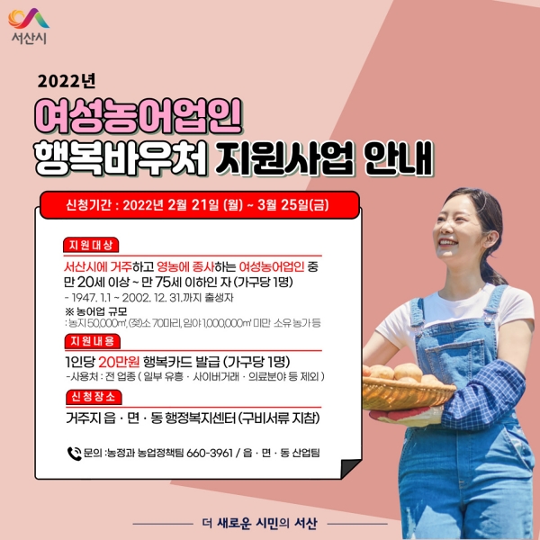 [충청뉴스큐] 충남 서산시가 여성농어업인의 다양한 문화활동 지원을 위해 1인당 20만원의 행복바우처를 제공한다.