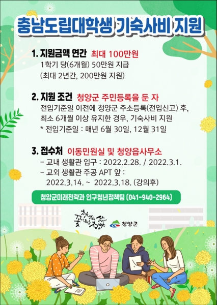 군은 도립대생들이 경제적 부담을 덜고 학업에 전념할 수 있도록 기숙사 생활을 하면서 청양군에 주소를 둔 대학생에게 기숙사비 4학기분 기숙사 외 자취생활을 하는 대학생에게 전입 축하금과 생활안정자금을 지원한다.