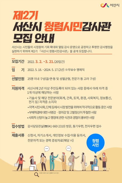 [충청뉴스큐] 서산시는 시민의 생활현장에서 각종 여론 수렴 및 불편사항을 해결해 투명하고 신뢰받는 감사행정을 수행하기 위해 3월 2일부터 21일까지 청렴시민감사관 25명을 공개 모집한다.