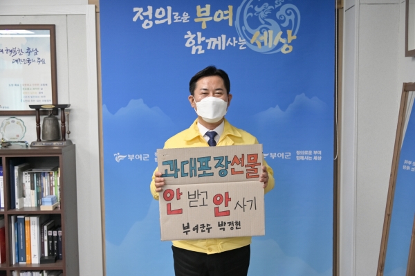 [충청뉴스큐] 박정현 부여군수가 4일 생활 속 실천을 통한 탄소중립 자원순환 경제 실현을 위해 ‘과대포장 안 받고 안 사기’ 릴레이 챌린지에 동참했다.