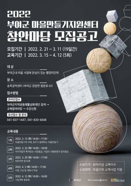 [충청뉴스큐] 부여군 지역공동체활성화재단에서 운영하는 마을만들기 지원센터가 마을만들기사업에 참여할 예비 신규마을 발굴을 위해 창안마당을 연다.
