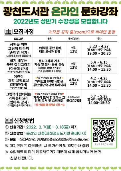 광천공공도서관은 지속되는 코로나19 변이와 감염 확산으로 인해 이번 상반기 문화강좌도 비대면 방식으로 운영한다.