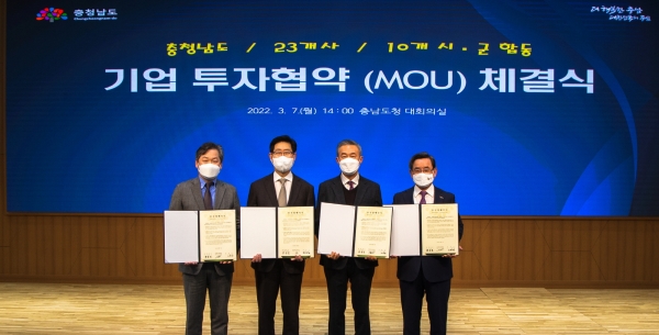 이날 협약식은 충청남도 10개 시·군과 23개 기업이 합동 투자협약을 체결하는 자리로 농업회사법인 해성과 ㈜에코바이오연구소는 2024년까지 장항국가생태산업단지 내 2만 6183㎡ 산업용지에 총 166억원 규모의 설비 투자와 60여명을 신규 고용할 계획이라고 전했다을 밝혔다.