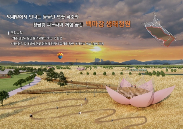 대규모 억새단지를 배경으로 한 백마강 둔치 일원 130ha 부지에 부여의 역사성과 생태자원을 연계한 정원을 조성해 2028년 국가정원으로 승인받는 것이 최종 목표다.
