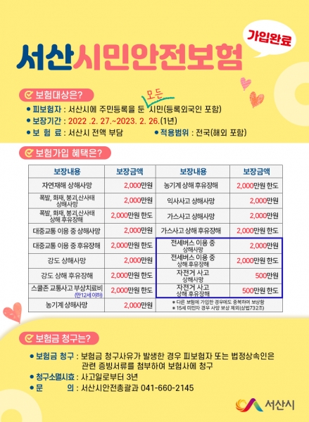 [충청뉴스큐] 충남 서산시민이면 누구나 재난사고 시 최대 2천만원을 보장받는다.