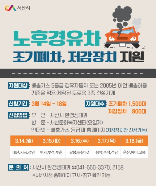 [충청뉴스큐] 충남 서산시가 쾌적한 대기환경 조성을 위해 노후경유차 조기폐차 및 배출가스 저감장치 부착 지원에 나선다.