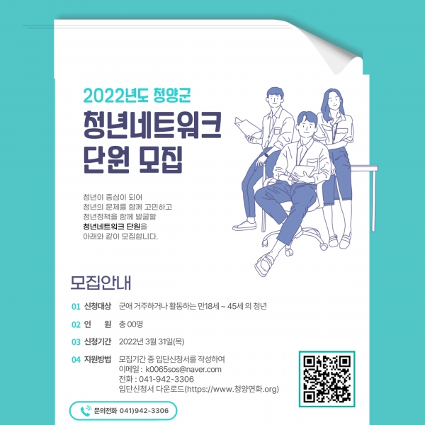 [충청뉴스큐] 청양군이 오는 31일까지 청년 문제에 대한 고민과 정책 발굴에 참여할 청년네트워크 단원을 공개모집 한다고 11일 밝혔다.