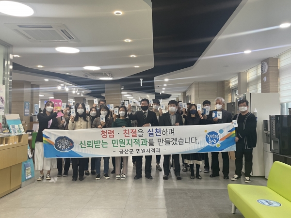 김홍식 민원지적과장은 “공정하고 투명한 청렴금산을 만들기 위해 청렴 핸드북 제작 등 청렴 정책을 이어가고 있다”며 “군민들께서 만족하시는 행정 서비스가 제공될 수 있도록 모든 공직자들과 힘을 모아 나가겠다”고 말했다.