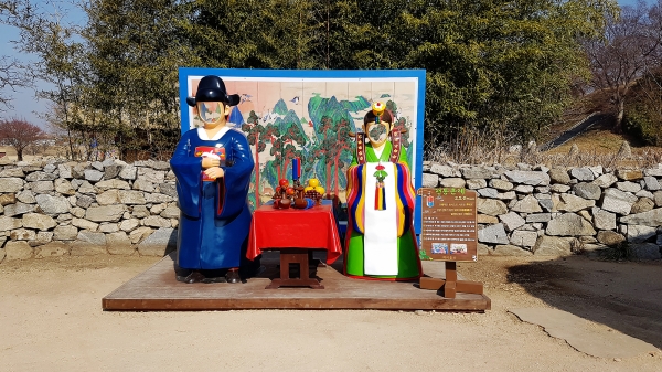 아름다운 그림의 목조 벽면을 세웠고 그 앞에 초례상과 신랑·신부 조형물을 조화롭게 배치했다.