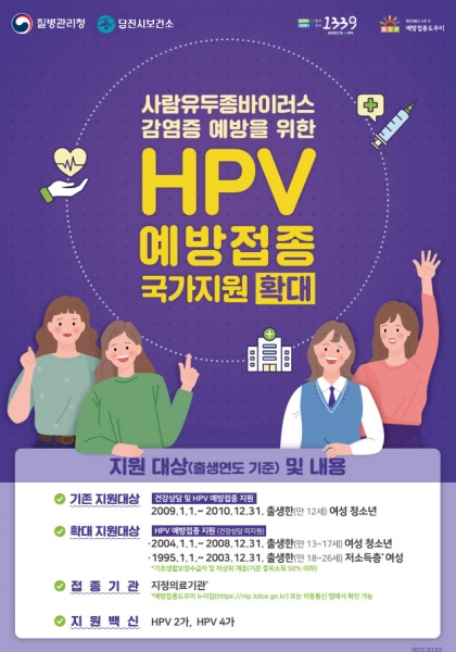 기존 HPV 예방접종 국가지원 대상자는 만 12세 여성 청소년이었으나 지난 14일부터 만 13~17세 여성 청소년과 만 18~26세 저소득층 여성으로까지 확대됐다.
