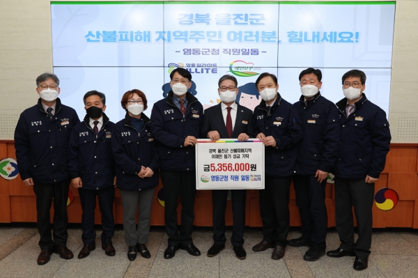 영동군은 지난 3월 4일부터 경북 울진 등 동해안 지역에 대규모 산불이 발생해 큰 피해를 입은 경북 울진군, 지역 주민들을 위해 전 직원들이 자율적으로 모금한 성금 5백35만6천원을 울진군청에 전달했다고 18일 밝혔다.