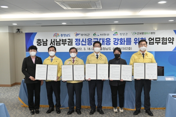 [충청뉴스큐] 부여군을 비롯한 서천군, 청양군 등 서남부권 지자체 와 충남도는 지난 18일 충남도청 상황실에서 보령엘피스병원과 ‘정신응급대응 강화’를 위한 협약을 체결했다.