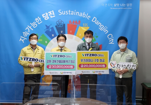 [충청뉴스큐] 당진을 대표하는 기업이자 리튬 1차 전지 생산업체 중 국내 1위, 세계 3위 기업인 ㈜비츠로셀은 지난 23일 시청을 방문해 당진시복지재단에 강원·경북 산불피해 복구 및 우크라이나 난민 구호를 위한 성금 5000만원을 전달했다.