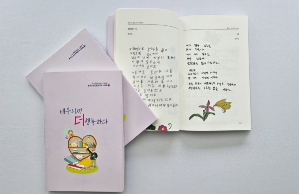 ‘배우니까 더 행복하다’에는 충주시평생학습관을 비롯해 충주열린학교, 평생열린학교, 충주늘푸른학교, 충주문화학교 등 지역 내 문해 교육기관에서 한글을 배우는 136명의 노인이 손수 만든 시화 작품이 수록됐다.