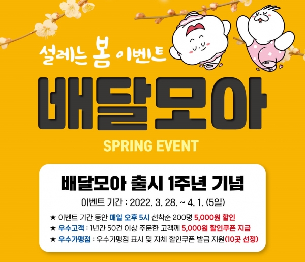 먼저, 3월 28일부터 4월 1일까지 매일 오후 5시부터 배달모아로 주문 시 선착순 200명에게 5천원 즉시 할인혜택을 제공하며 이와 함께 지난 1년간 배달모아를 50회 이상 이용한 회원을 대상으로 5천원 할인 쿠폰을 지급한다.