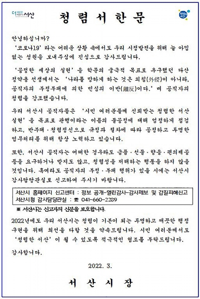 28일 시에 따르면 청렴서한문에는 앞으로도 시 공직자의 청렴도를 높이고 시민 관점의 적극적인 행정을 약속하는 내용이 담겼다.