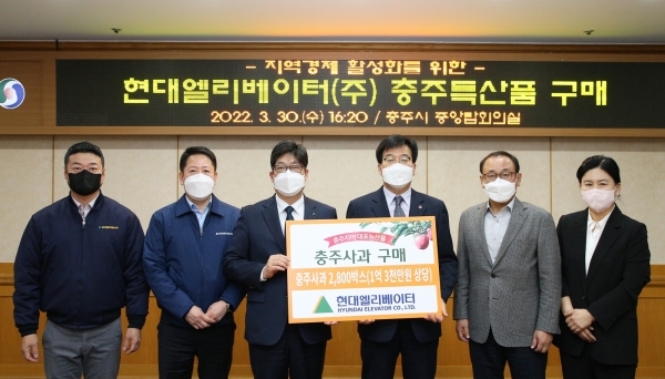 현대엘리베이터는 코로나19 장기화로 어려움을 겪고 있는 지역 농가와의 상생을 위해 충주사과 2,800 상자를 구입하며 지역 농가에 힘을 보탰다.