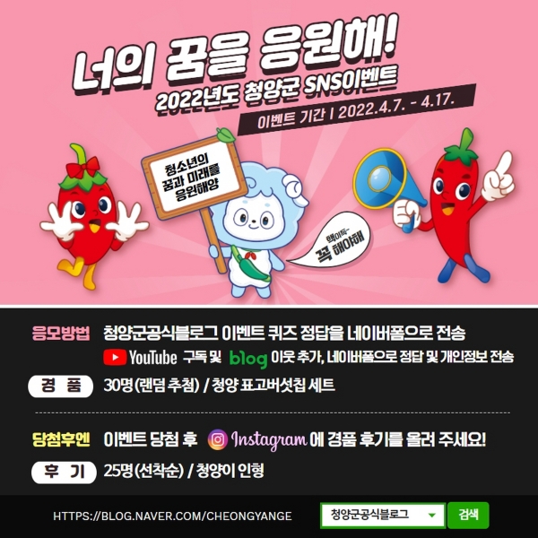 [충청뉴스큐] 청양군이 7일부터 17일까지 공식블로그와 공식 유튜브를 연계한 ‘너의 꿈을 응원해’ 퀴즈 이벤트를 진행한다고 6일 밝혔다.