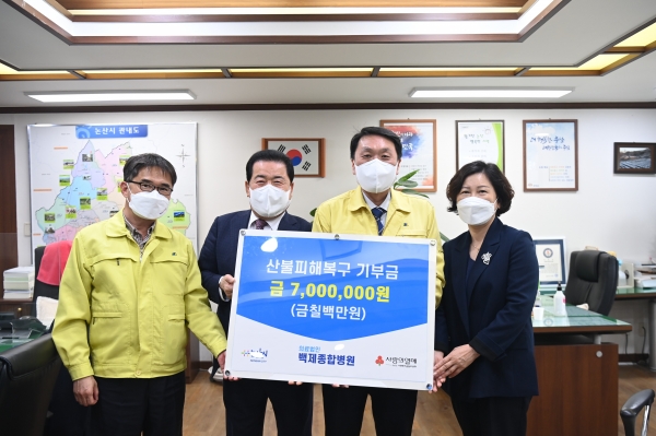 [충청뉴스큐] 논산시는 백제종합병원에서 산불피해로 어려움을 겪고 있는 강원·경북 지역의 복구 지원을 위해 700만원의 성금을 기탁했다고 전했다.