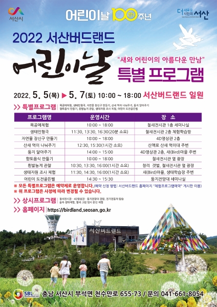 [충청뉴스큐] 충남 서산시가 오는 5월 5일부터 7일까지 3일간 ‘새와 어린이의 아름다운 만남’을 주제로 어린이날 특별프로그램을 운영한다.