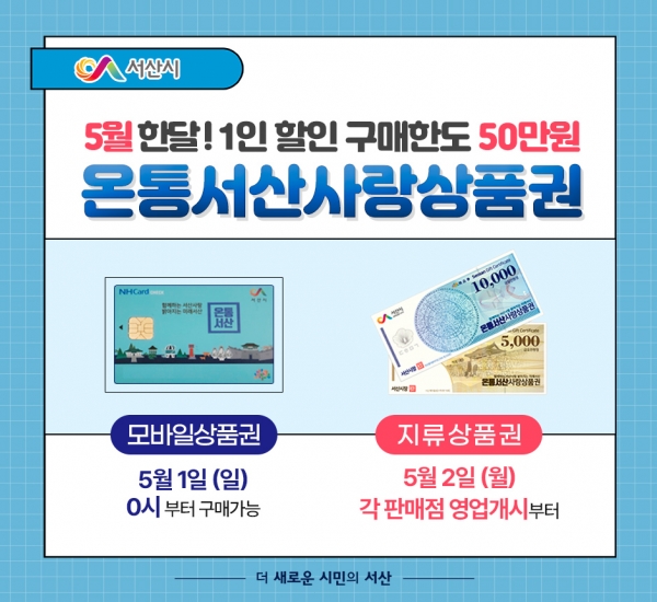 [충청뉴스큐] 충남 서산시가 5월 가정의 달을 맞아 온통서산사랑상품권 할인 구매한도를 50만원으로 상향한다.