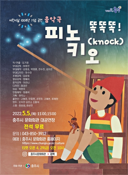 [충청뉴스큐] 충주시는 어린이날을 맞아 카를로 콜로디의 명작 동화 ‘피노키오’를 현대적으로 각색한 어린이 음악극 ‘똑똑똑 피노키오’를 충주시 문화회관에서 상연한다.