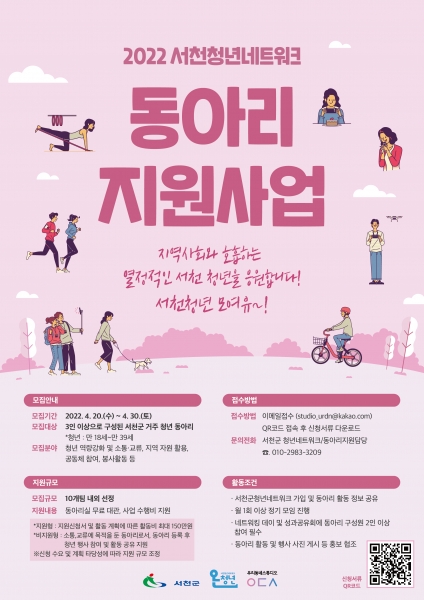 신청 대상은 서천군에 거주하는 만 18세 이상 만 39세 이하 청년 3명 이상으로 구성된 동아리로 자율적인 활동을 바탕으로 정기적인 모임을 운영하는 동아리면 신청할 수 있다.