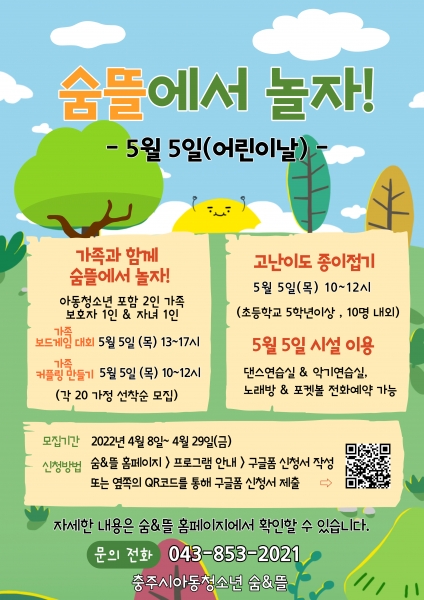 [충청뉴스큐] 충주시 아동·청소년 숨&뜰에서는 개관 1주년을 맞아 오는 5월 5일‘제2회 숨뜰에서 놀자’프로그램을 개최한다고 밝혔다.