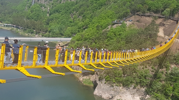 [충청뉴스큐] 금산 월영산 출렁다리가 지난 4월 28일 개통한 후 첫 주말에만 2만여명이 몰리면서 대박 조짐을 보였다.