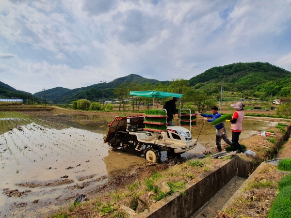 청산면 만월리 김기문, 김인자 부부는 5월 1일부터 3일간 만월리 359 일원 6만여㎡ 논에서 첫 모내기를 진행했다.
