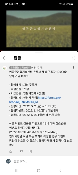 [충청뉴스큐] 충북 영동군은 지역 농업인과의 온라인 소통방인 영동군농업기술센터 유튜브 채널 구독자 수 1만명을 달성해 감사 이벤트를 진행한다고 밝혔다.