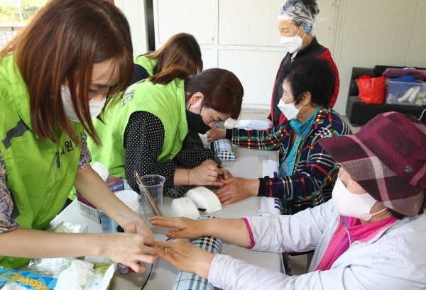 이날 향수상록봉사단 등 9개 단체에서 30여명이 참여해 마을 어르신들을 대상으로 이·미용, 칼갈이, 정신건강 체크, 네일아트, 손 마사지 등의 전문 자원봉사를 통해 마을 어르신들에게 즐거움을 제공했다.