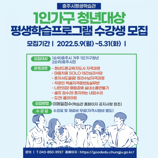 2022년 충청북도 평생교육 프로그램 공모사업 선정으로 사업비 6,000만원을 들여 진행하는 이번 사업은 최근 지속해서 늘어나는 1인 가구 청년들의 평생학습 참여기회 확대 및 사회진출 기회 제공을 목적으로 운영하는 사업이다.