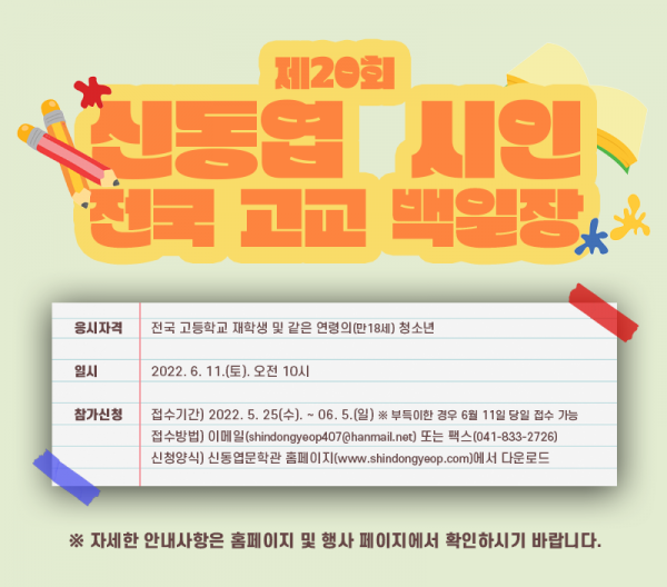 [충청뉴스큐] 신동엽기념사업회와 신동엽문학관은 오는 6월 11일 오전 10시부터 부여 군민체육관과 신동엽문학관에서 부여군의 지원으로 ‘제20회 신동엽 시인 전국 고교 백일장’을 개최한다.