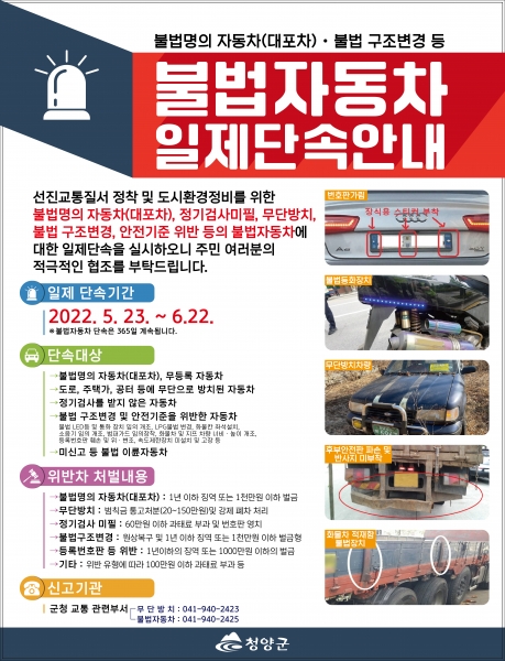 한은규 사회적경제과장은 “군민 안전과 생활에 불편을 초래하는 불법 자동차 근절을 위해서는 적극적 단속도 중요하다”며 “올바른 자동차 문화 정착을 위해 군민들의 많은 관심과 협조를 당부한다”고 말했다.