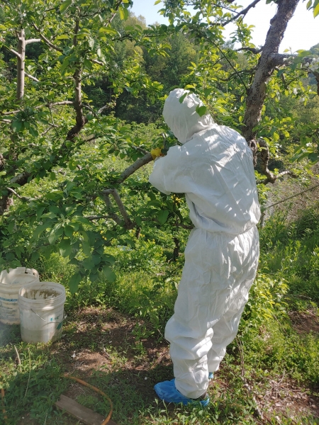 특히 과수원 출입용 신발과 작업복은 외부 활동용과는 구별해 사용하고 위생덧신·일회용 부직포 작업복 및 장갑 등을 착용해 외부 오염물질이 과수원 내부로 유입되는 것을 막아야 한다.