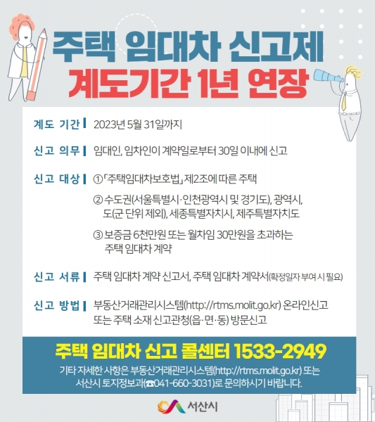 [충청뉴스큐] 충남 서산시가 5월 31일 자로 종료 예정이던 주택 임대차 신고제 계도기간을 1년 연장한다.