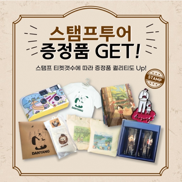 기념품은 스탬프 개수에 따라 단양 지도가 그려진 엽서부터 단양명소 에코백, 티셔츠, 피크닉 매트, 다소미 양말 등 다채롭게 준비돼 있으며 단양 여권 구입처인 위 4곳에서 수령할 수 있다.
