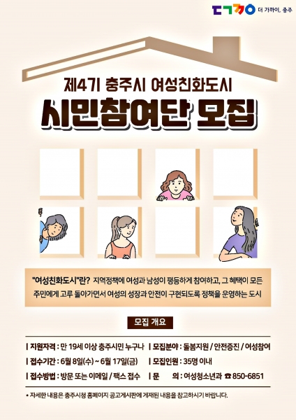 [충청뉴스큐] 충주시는 오는 17일까지 여성친화도시 조성을 위한 발전적인 정책 제안 및 모니터링 등의 활동을 수행할‘제4기 충주시 여성친화도시 시민참여단’을 모집한다.