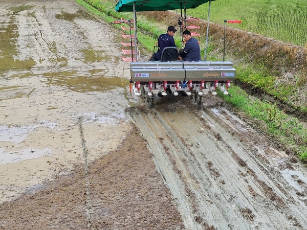 [충청뉴스큐] 금산군은 지난 8일 남일면 마장리 일원에서 기존 벼 직파재배 문제점을 해결할 수 있는 무논점파 재배기술 지도 연시회를 개최했다.