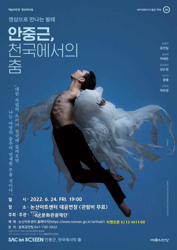 이번 상영작은 예술의 전당에서 진행한 ‘2022 예술의전당 SAC on Screen’공모에 선정된 사업으로 ‘M발레단’과 더불어 수많은 수상 실적에 빛나는 최고의 발레 스타들이 대거 출연하는 수준 높은 고품격 발레작품이며 오는 24일 오후 7시 논산아트센터 대공연장에서 진행된다.
