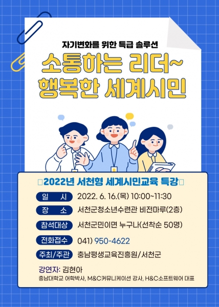 [충청뉴스큐] 서천군이 오는 16일 오전 10시에 서천군청소년수련관 비전마루에서 ‘자기변화를 위한 특급 셀프리더십’을 주제로 세계시민교육 특강을 개최한다고 밝혔다.