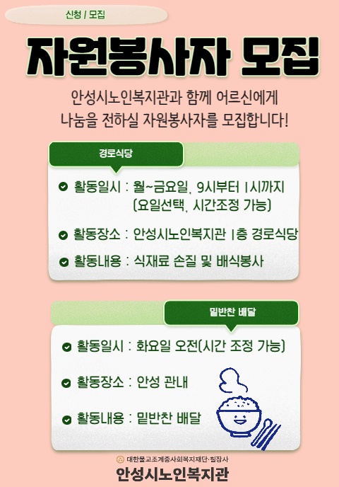 [충청뉴스큐] 대한불교조계종사회복지재단 안성시노인복지관이 어르신들에게 따뜻한 식사 나눔을 전할 ‘경로식당’ 및 ‘식사배달사업 밑반찬 배달’ 자원봉사자를 모집한다고 밝혔다.