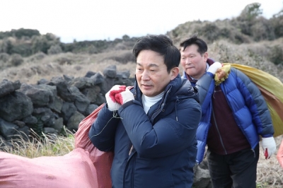 원희룡 지사는 25일 오전 9시 30분부터 제주시 조천읍 신촌리의 속칭 ‘닭머루’ 해안변 일대에서 해양환경단체, 지역주민, 어촌계 등 200여 명과 함께 해양환경 정화활동을 펼쳤다.