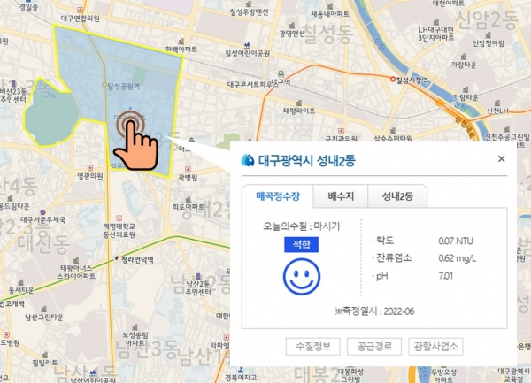 또한, 대구시 전역 배수지에 설치된 수질계측기에서 실시간으로 측정되는 수질 정보를 수집해 각 항목 수치에 따라 음용 적합 여부도 함께 제공한다.