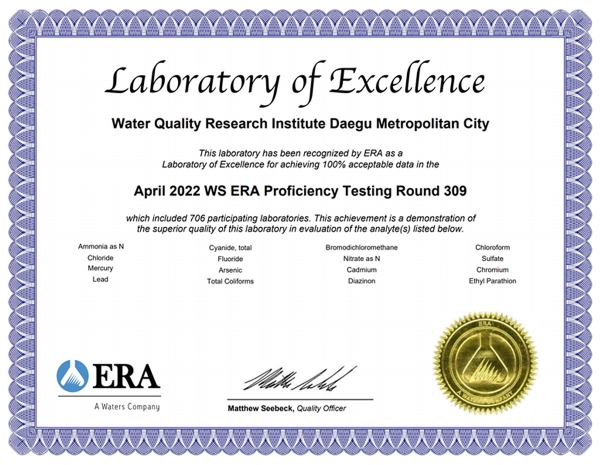 대구시 상수도사업본부 수질연구소는 2020년 국제공인시험기관으로부터 수질분석에 대한 글로벌 공신력을 확보했으며 지난 4월 미국 환경자원협회 가 주관하는 국제숙련도시험 평가에 참여해 18개 검사 전 항목에서 최고 등급인 ‘만족’ 판정을 받아 3년 연속 최우수 기관으로 선정되는 쾌거를 이루었다.